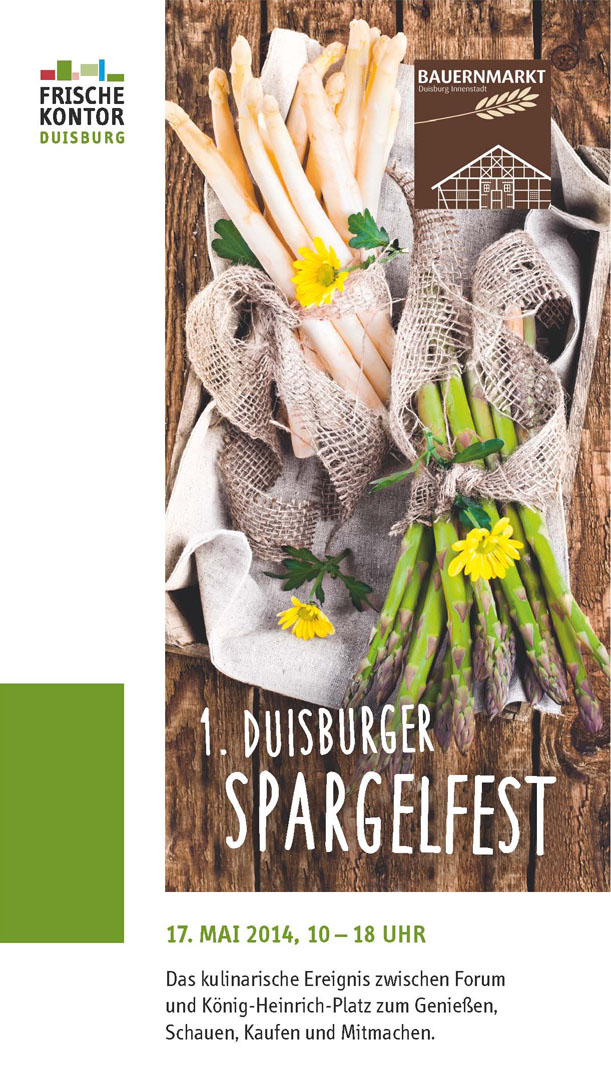 Dieses Jahr findet der Höhepunkt der Duisburger Spargelsaison auf dem Bauernmarkt in der City statt. Das 1. Duisburger Spargelfest bietet am Samstag, 17. Mai 2014, von 10:00 bis 18:00 Uhr zwischen Forum und König-Heinrich-Platz viele Attraktionen rund um das königliche Gemüse.