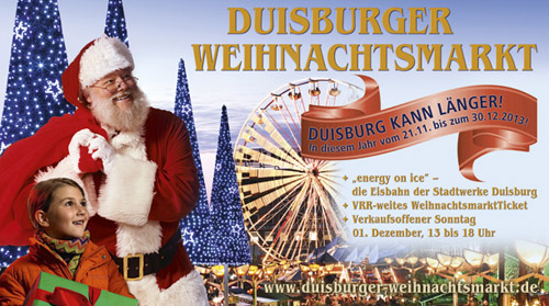 Duisburg kann länger! So lautet der diesjährige Slogan des 36. Duisburger Weihnachtsmarktes, der in diesem Jahr erstmals länger als sonst am 21. November beginnend bis zum 30. Dezember 2013 stattfinden wird. Und zum Glück kann Duisburg wirklich bald länger, denn bis zum Start sind es Stand heute (18.11.13) nur noch 4 Tage und somit nur noch 3 Mal „wach werden“!
