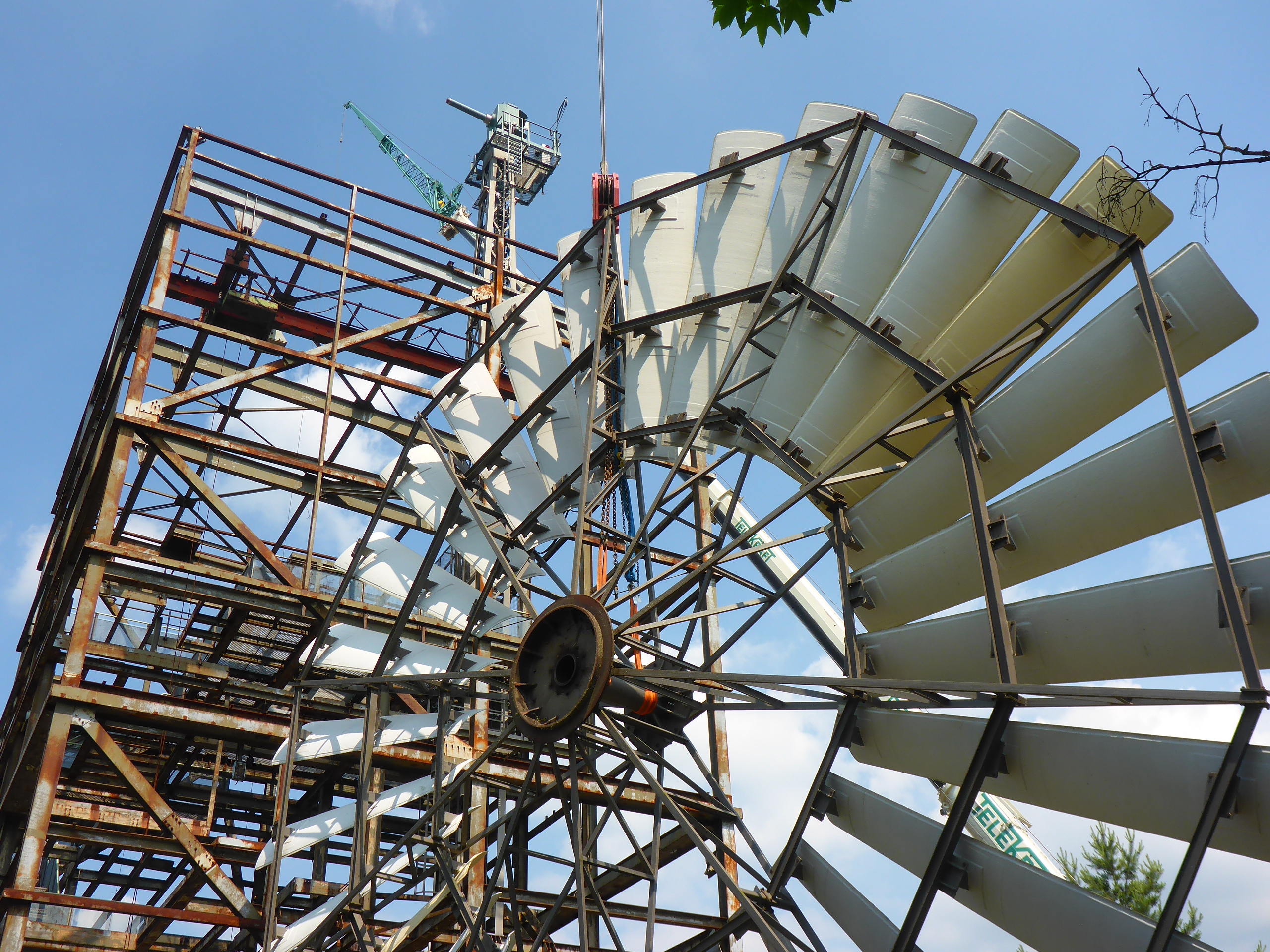 Um das Windrad mit seinen 16 Metern Durchmessern in 40 Metern Höhe zu seiner Befestigung zu heben, war absolute Windstille notwendig gewesen.