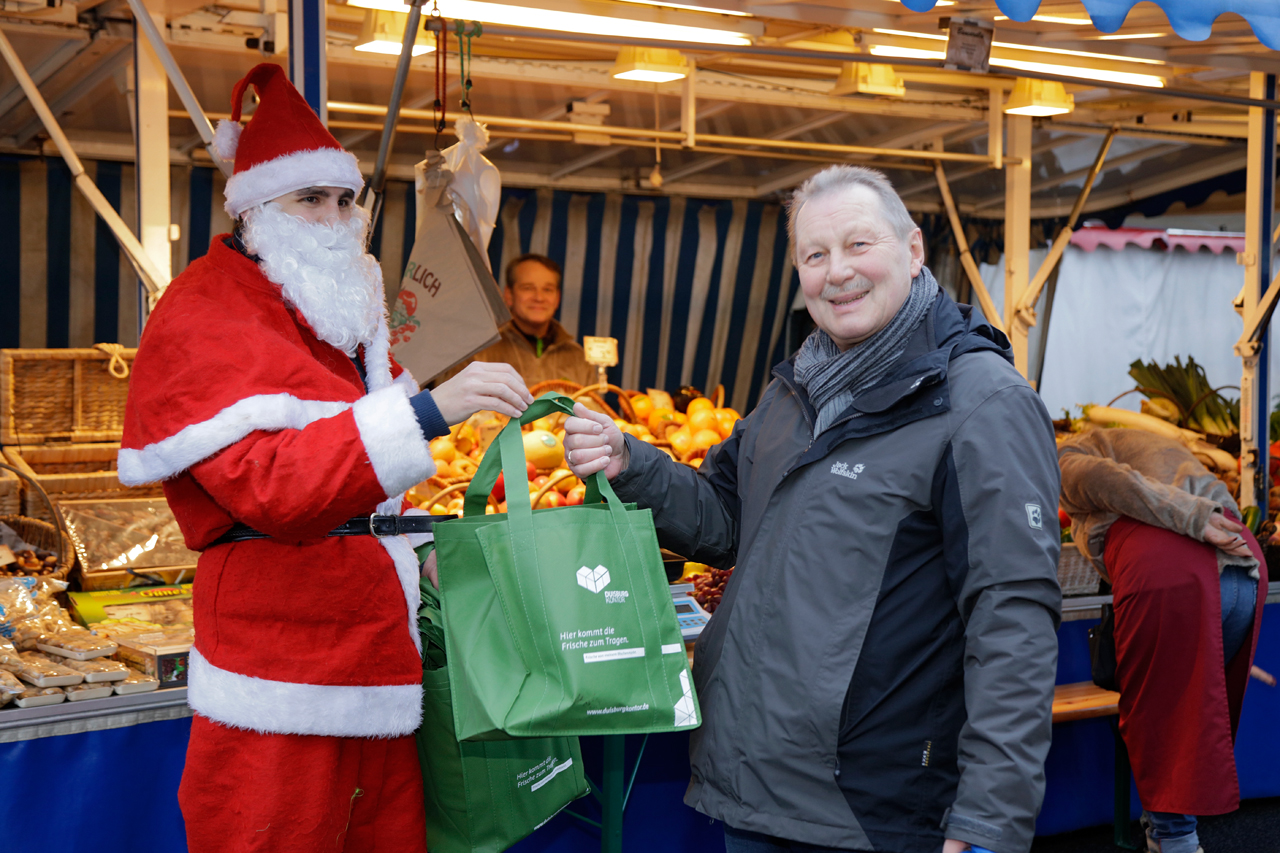 Freuen dürfen sich dann besonders die jüngeren Marktbesucher auf leckere Präsente, aber auch für alle anderen Gäste des Marktes hat der bärtige Mann frische Wochenmarkt-Einkaufstaschen dabei.
