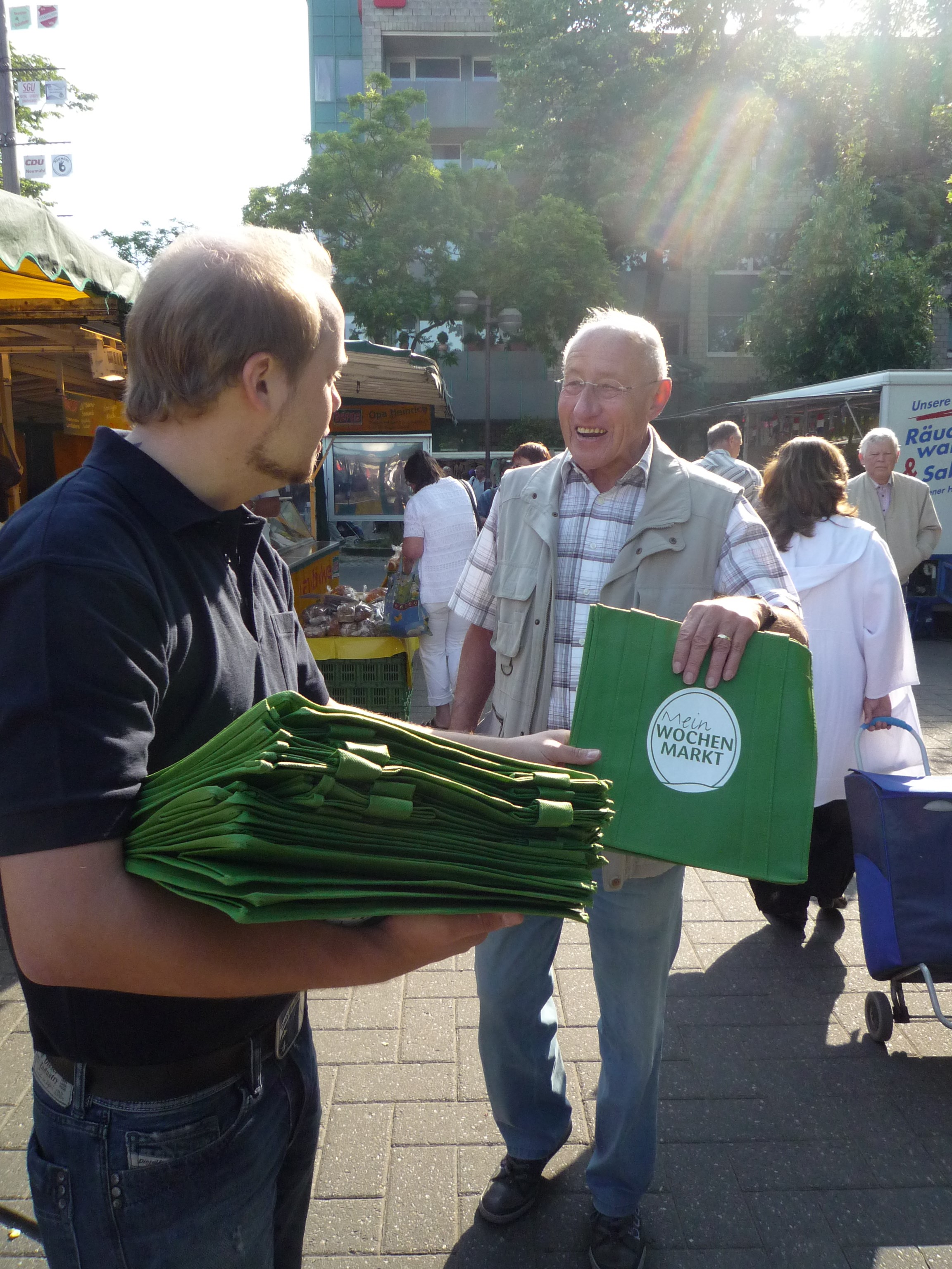 So werden am Freitag, 15. April 2016, von 10 bis 12 Uhr auf dem Wochenmarkt in Bergheim (Alfred-Hitz-Platz) und von 14 bis 16 Uhr auf dem Wochenmarkt in Duissern (Königsberger Allee) frische Wochenmarkt-Einkaufstaschen verteilt – und dies, solange der Vorrat reicht. Am Samstag, 16. April 2016, geht es von 9 bis 12 Uhr auf dem Hochfelder Wochenmarkt (Saarbrücker Straße/Fröbelstraße) weiter. Auch hier dürfen sich die Kundinnen und Kunden auf das beliebte Geschenk freuen.