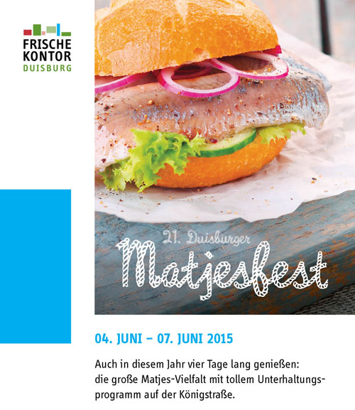 Das Duisburger Matjesfest, dessen 21. Auflage in diesem Jahr vom 4. bis 7. Juni 2015 stattfinden wird, gehört inzwischen zu den etabliertesten und größten Veranstaltungen dieser Art in der Bundesrepublik und lockt Jahr für Jahr viele Tausend Besucherinnen und Besucher aus Duisburg sowie den umliegenden Städten in die Duisburger City. Nach der sehr erfolgreichen Jubiläumsveranstaltung im letzten Jahr war Veranstalter FrischeKontor und den teilnehmenden Händler schnell klar, dass das beliebte Matjesfest auch in diesem Jahr wieder an 4 Tagen stattfinden soll.