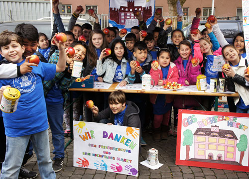 Jennifer Poschen sagte bei der Einstimmung auf die Jubiläumsfeier: „Wir wollten auf dem Markt, der unserer Schule den Namen gibt, ein wenig Werbung für unseren Geburtstag machen. 100 Jahre, das ist ja schon was. Und wir wollten uns beim FrischeKontor für die Unterstützung bedanken. Durch ihre Spende muss kein Kind auf sein T-Shirt verzichten, nur weil die Familie das Geld nicht dafür hat.“Wie heißt es in den Schullied: „Wir wollen heute alle Freunde sein, drum lass ich dich auch nicht allein.“