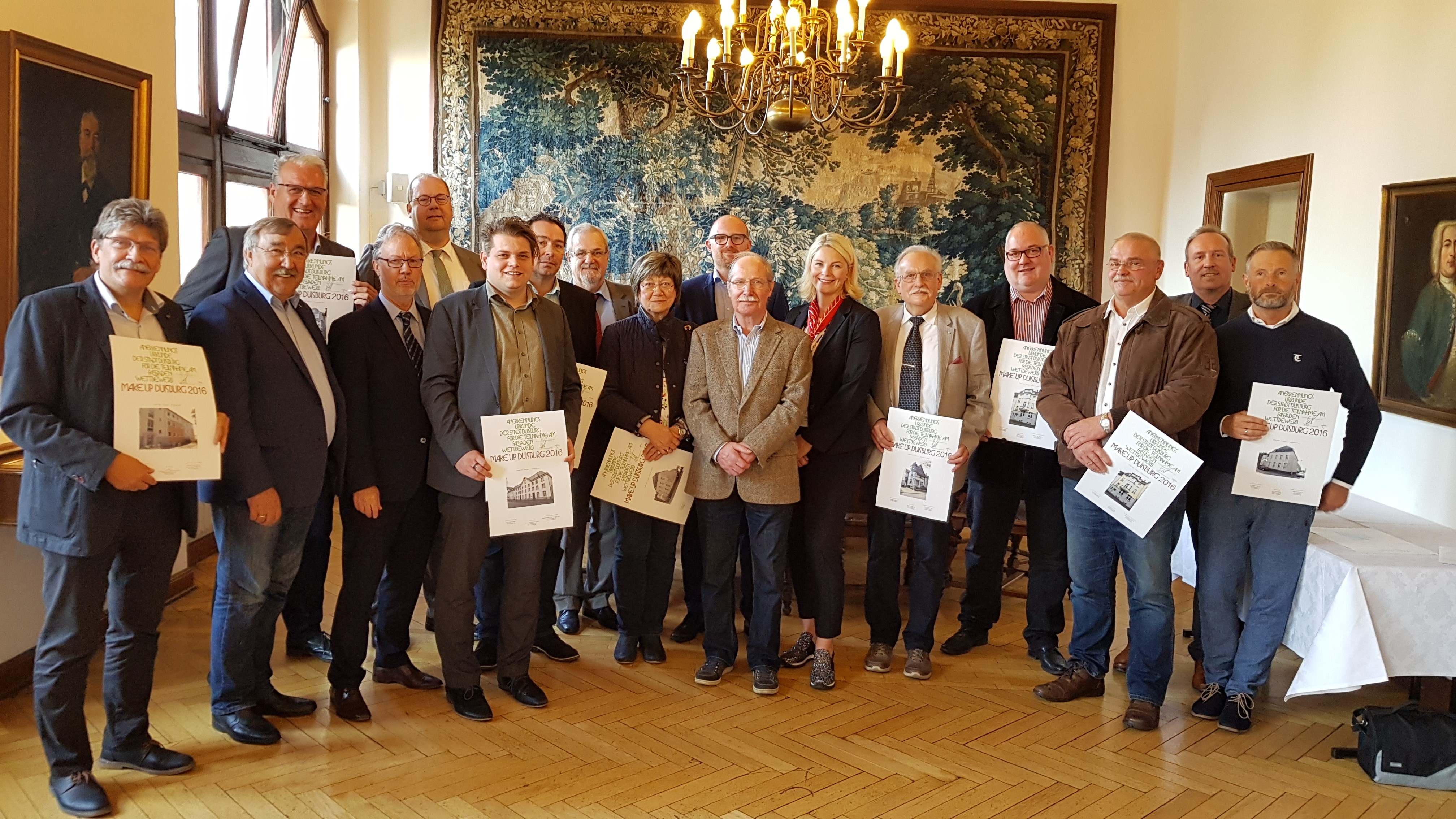 Die Gewinner des Jahres 2016 wurden zur offiziellen Preisverleihung in das Duisburger Rathaus eingeladen. Hier wurden Sie von Oberbürgermeister Sören Link, Bürgermeister Manfred Osenger und Peter Joppa, Geschäftsführer der Duisburg Kontor GmbH, persönlich beglückwünscht. Die ersten drei Plätze aus den Kategorien „Gebäude mit Stuck“ und „Gebäude ohne Stuck“ konnten sich über Geldpreise im Wert von insgesamt 5.000 Euro freuen. Auch die ersten drei Plätze aus der Kategorie „Wohnsiedlun-gen/Wohnanlagen“ wurden feierlich geehrt.